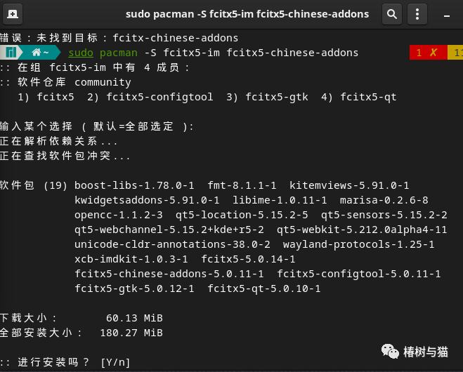sudo pacman -S fcitx5-im fcitx5-chinese-addons