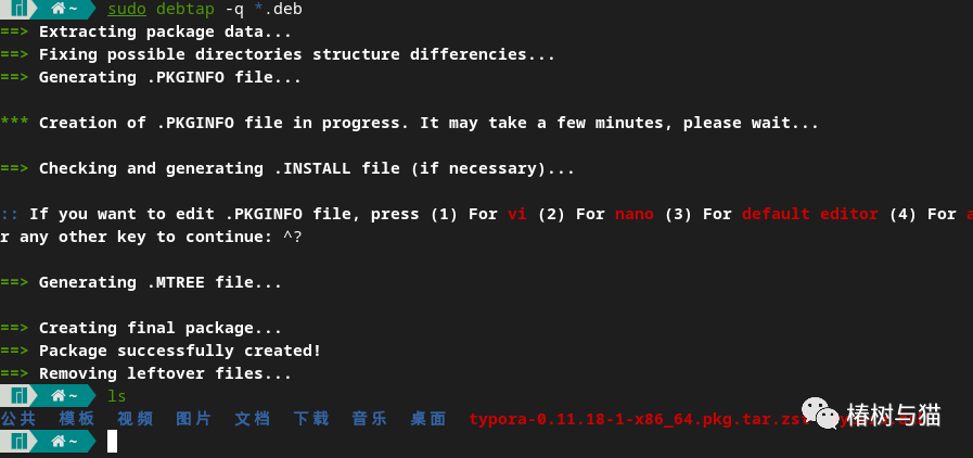 这里我们使用匹配模式,使用*代替了typora。-u是更新debtap,-q是静默模式的意思l。如果不出意外,你的目录下会出现一个压缩包:
