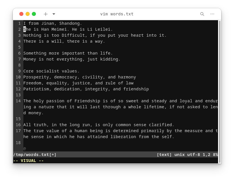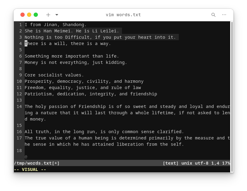 这个用于选择。在其他编辑器中,我们都是使用鼠标选择,然后滚动滚轮进行选择,在 VIM 中选择需要进入可视模式。进入可视模式之前先确认自己在普通模式:按Esc。进入可视模式的命令有两个: