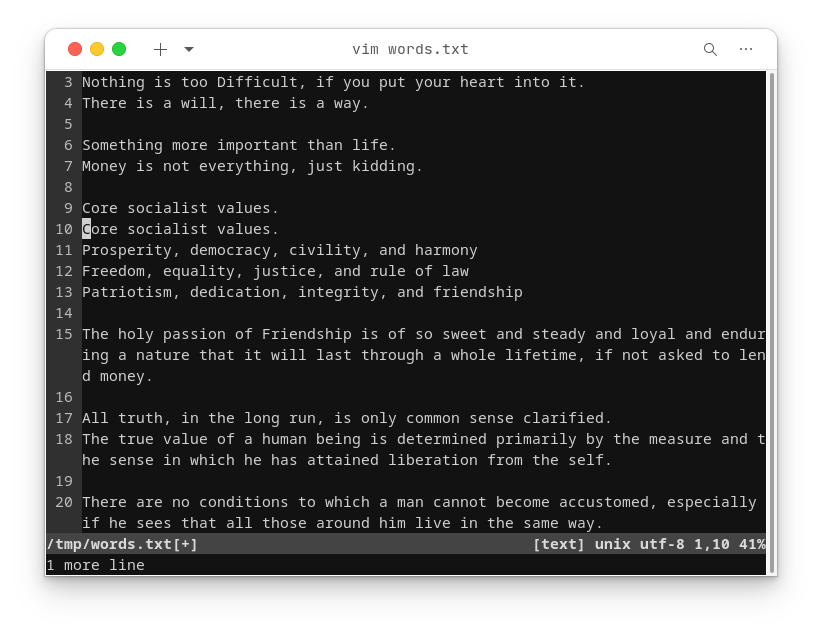 就这样,一个初学者还没有入门,基本就被劝退了。这就好比,刚学英语的时候被告知“英语至少有 25 万个单词,历史上堆积的甚至超过 40 万个,一个人一辈子大约 8 万天,要背完所有的单词至少每天记住 5 个单词”,我相信就是丘吉尔也觉得活着好累。所以学 VIM 的时候,要想退出很简单 —— 找个大佬,让他教你,他基本会把你劝退,因为他大概率上来就是一个快捷键图。