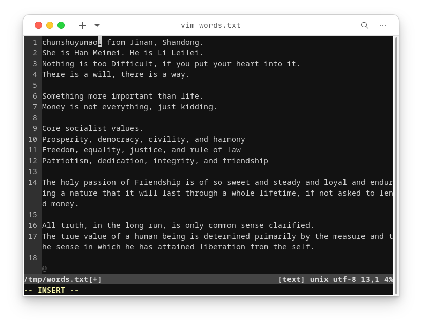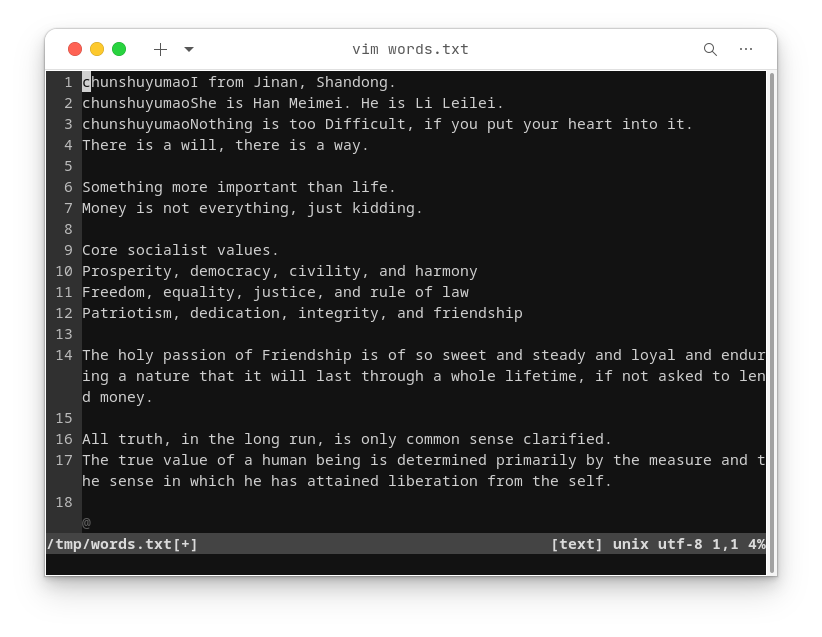 下面来看块模式。块模式通常用于插入和删除。比如我要在第一第二第三行之前插入我的大名:光标移动到第一行的第一个字符,Shift+v(也就是大写 V),把光标往下移动到第三行,输入Shift+i,然后输入 chunshuyumao —— 注意,这时候只有第一行出现了 chunshuyumao,接下来连按两次Esc,完成。