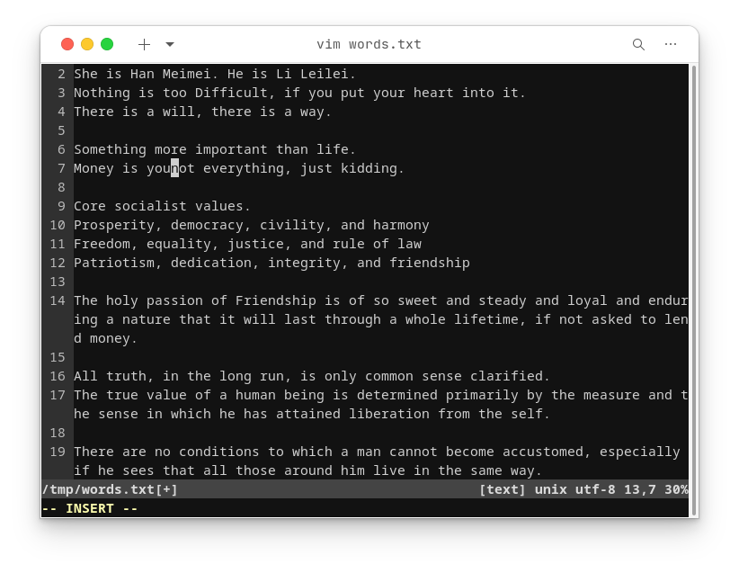 插入模式Insert Mode,普罗大众眼中编辑器的默认模式。这种模式就是打字时的模式,许多编辑器的默认模式就是这个。
