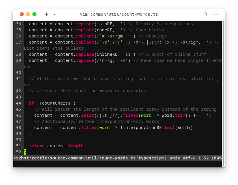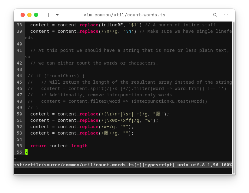Windows 用户,建议通过文件管理找到这个文件,然后使用你喜欢的编辑器打开。Linux 用户可以在命令行上输入 vim source/common/util/count-words.ts 直接打开文件进行修改。