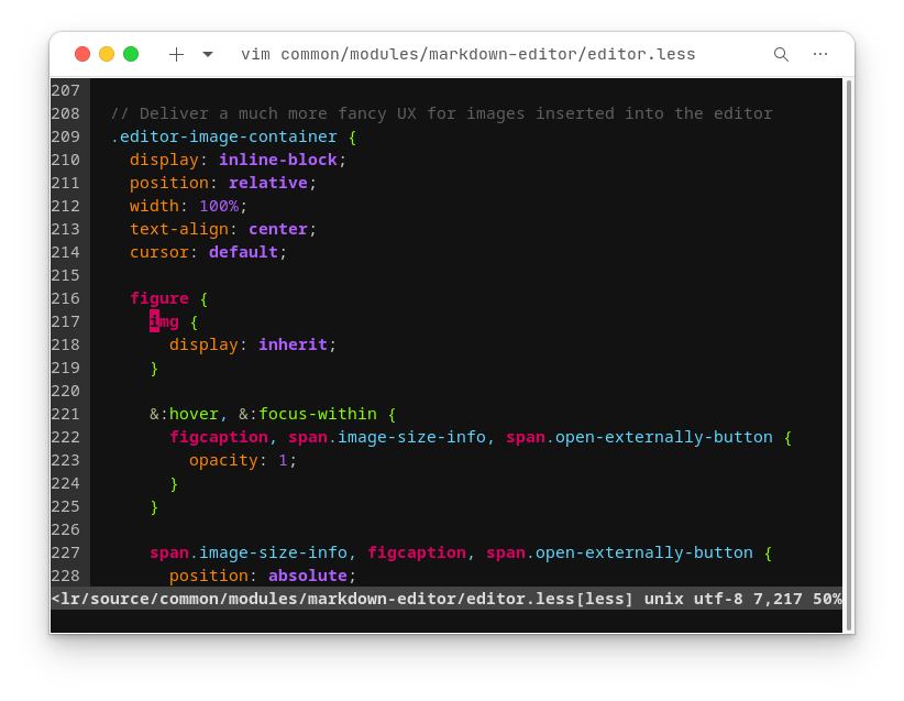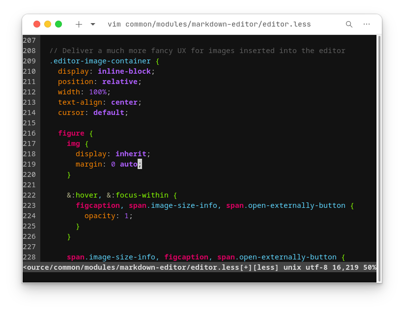 图片居中的源码位于 source/common/modules/markdown-editor/editor.less 文件中,使用任意文本编辑器打开。转到 217 行——或者慢慢找也行。在 figture 里边的 img 添加 margin: 0 auto;,表示居中对齐。保存退出。