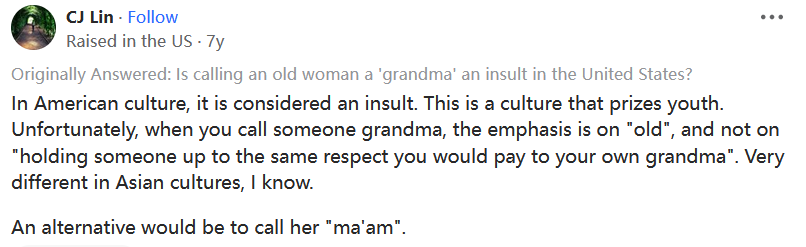 在美国文化中,叫陌生的老年人grandma被认为是一种侮辱。这源自珍视青年的文化。当你这么做时,很不幸,你的话语中就透露出某人“老”的感觉,而不是我们认为的“以你对自己奶奶的同样尊重来对待某人”。我知道,这跟在亚洲文化中很不一样。