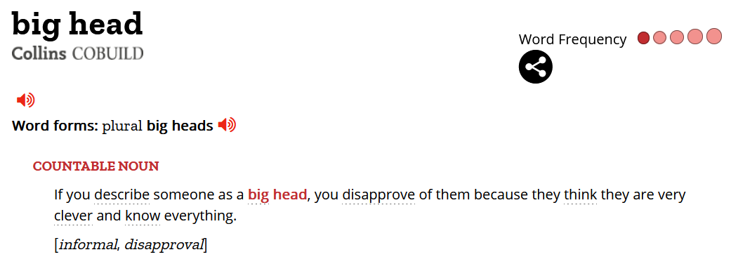 如果你描述某人是一个big head,那么你就是以一种不认同的表达方式来指代他们,因为这类人认为自己很聪明,什么都知道