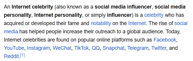 除此之外,根据其依附于平台的属性,“网红”在英语中也可以说成 某个平台+er,表示这个人是这个平台的创作者,就比如
