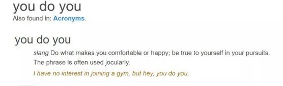 "you do you" 的意思是 "做你自己" 或者 "做你想做的",通常用于表示支持某人做自己想做的事情,或者表示不干涉某人的决定和行为。也可以用于表示鼓励某人在自己的方式和行为中保持真实和独立。还可以指我行我素,是个中性词。