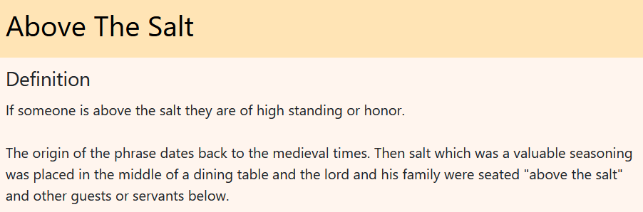 如果我们说某人above the salt意思是ta有很高的地位或荣誉。这个短语的起源可以追溯到中世纪。当时盐是一种珍贵的调味品,被放在餐桌中间,主人和他的家人坐在盐上游(从前长餐桌中间摆盐缸,上面一半算是上席),其他客人或仆人坐在下方。