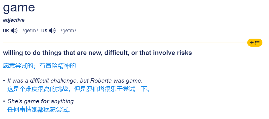 “I'm game”在口语中通常用于回答别人问你要不要一起的时候,这大概是源于game作为形容词的用法,我们可以从剑桥词典中发现它作为形容词的意思是“愿意尝试的;有冒险精神的”。