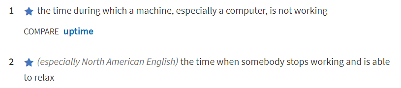 downtime 常见的意思是电脑停止工作的时间,中国人常说的宕机也就是来源于down 机。其反义词就是 uptime ,表示电脑正常运行的时间。