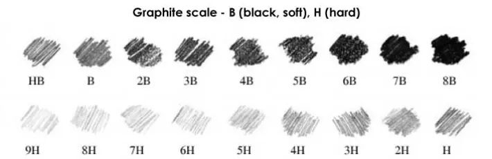 软铅芯用字母B来表示它们黑的程度。然后,数字被用来表示柔软程度——数字越高,铅越软,所以画出来越黑。例如,2B铅比B铅软,会产生更黑的痕迹。4B比2B等要软。