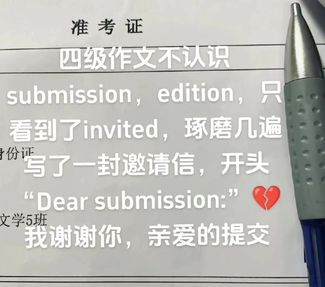 “好消息,我知道submission的意思;坏消息,我只知道submission是投降,不知道还有个建议的意思。所以我四级作文写了封投降书。”