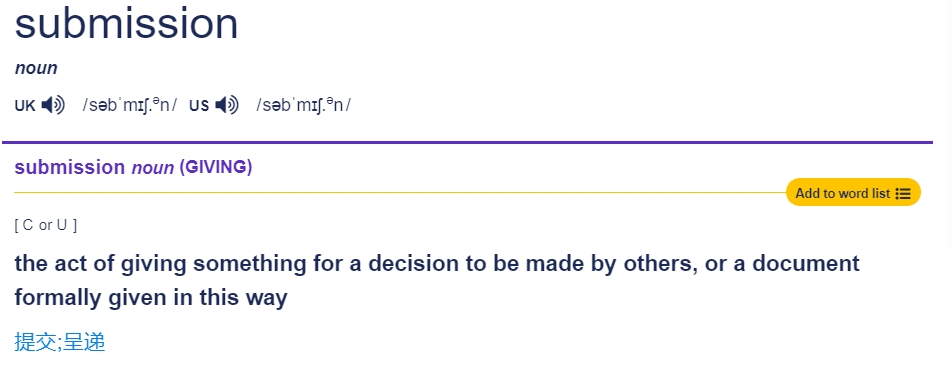 Submitting something 是指谦卑地把它上交以作评判(例如书面作业)。Sub-mission是有处于下位的意思,所以需要谦卑。