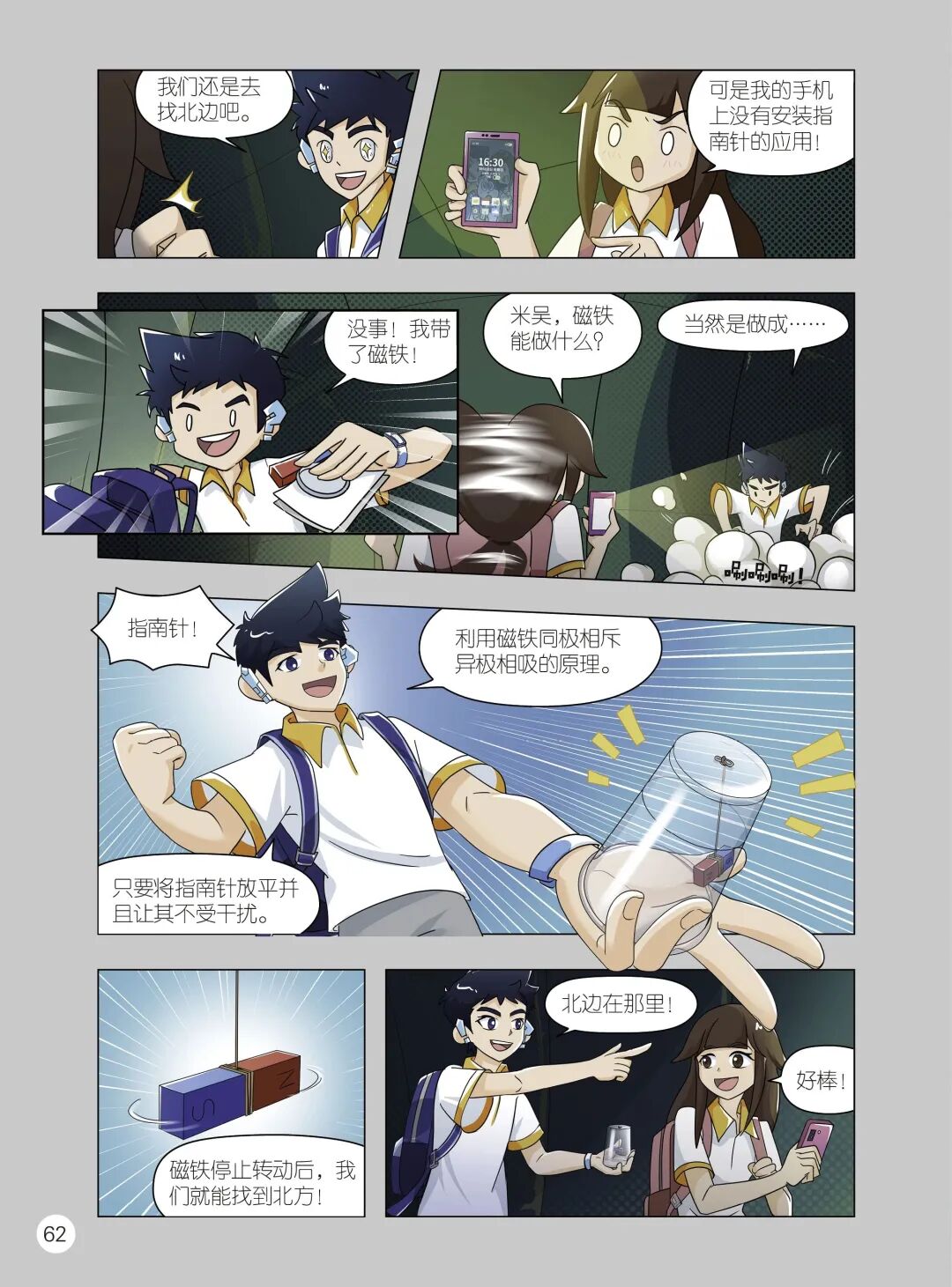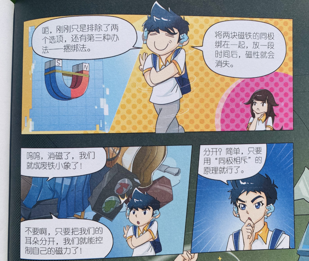最后依据“同极相斥”的原理,米吴和小伙伴通过把同极捆绑到一起,成功关闭磁力。