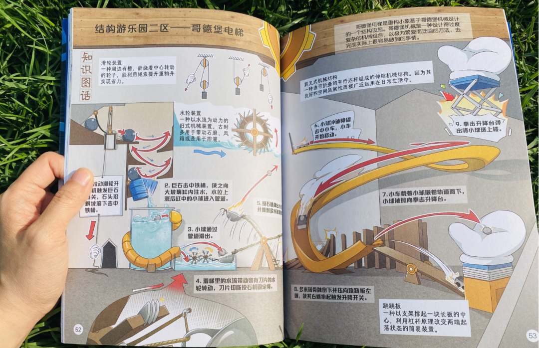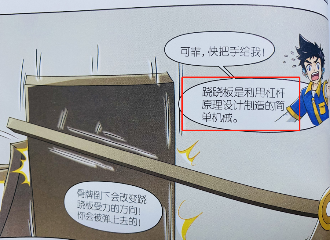 比如:我家小朋友,看的这一册故事中,涉及到了三角形的稳定性、杠杆省力、弹簧减震等知识点。
