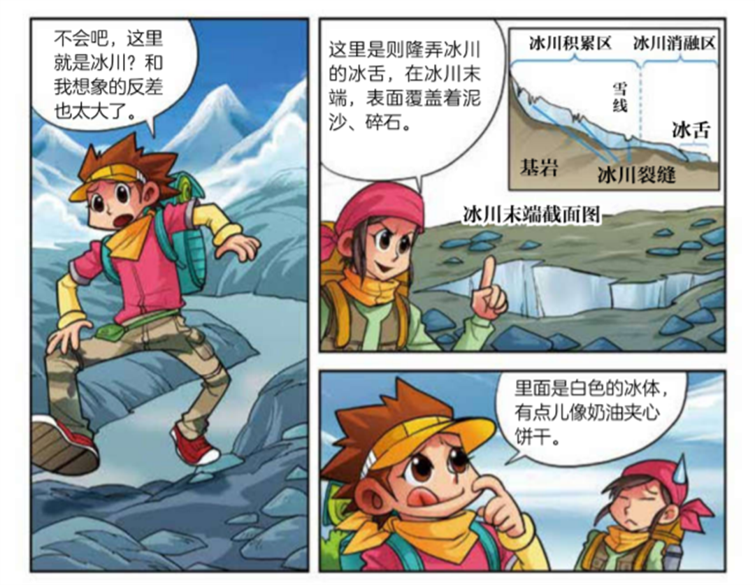 冰川看上去是一大块冰体,但其实它的内部结构非常复杂,分为冰川积累区和消融区,还有雪线、冰川裂缝、冰舌。