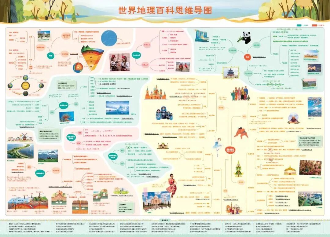 将地理教材上的考点用拉线图、示意图,进行系统化、思维化立体展示,丰富了教材中展不开讲述的知识点,让孩子对世界的了解更深入,更具象化。