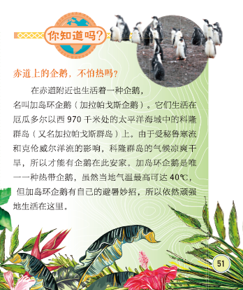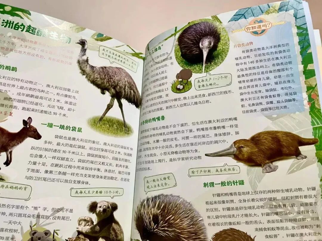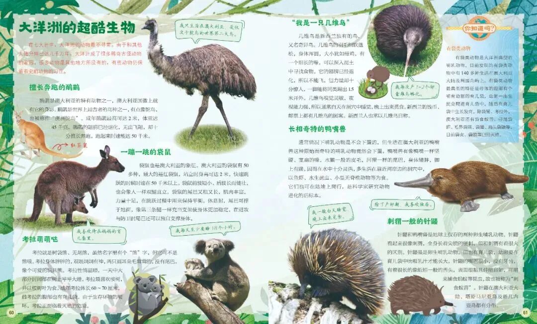 和一般动植物科普书不同,地理书中讲动物会伴随着地理区域来介绍。这些动植物的介绍都做成了对开的专题页,主题性更强。