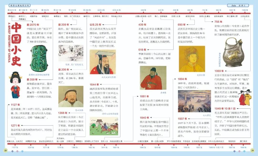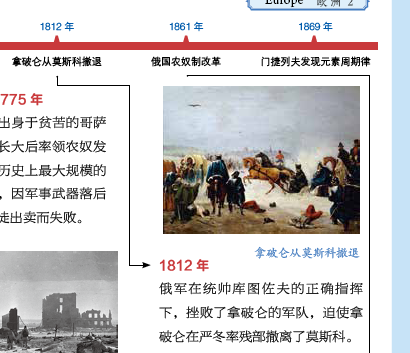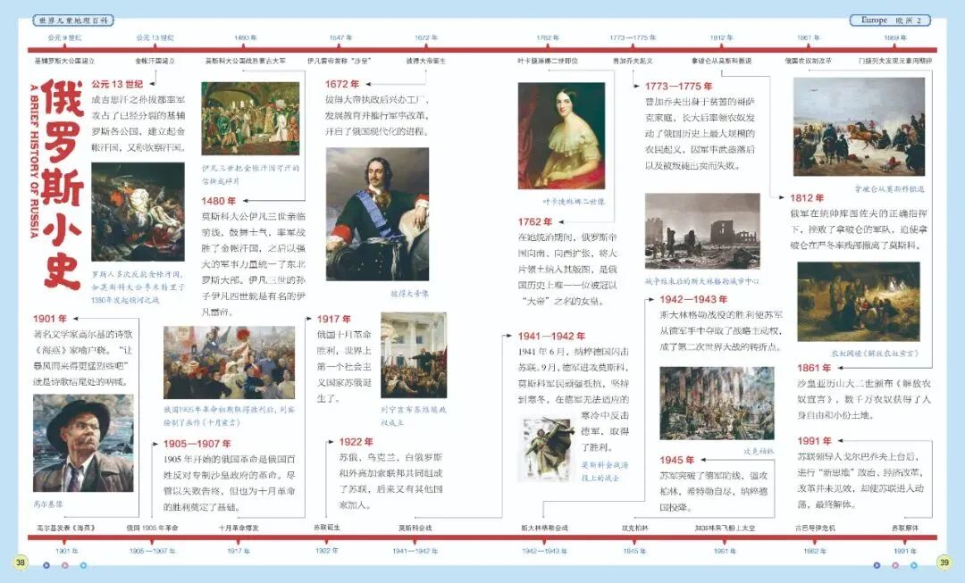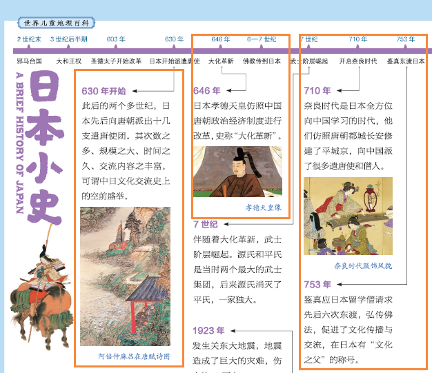 这套书还给一些重点国家设计了“小史”专题,罗列了国家发展进程中的重要历史事件,用时间轴的方式进行串联呈现。