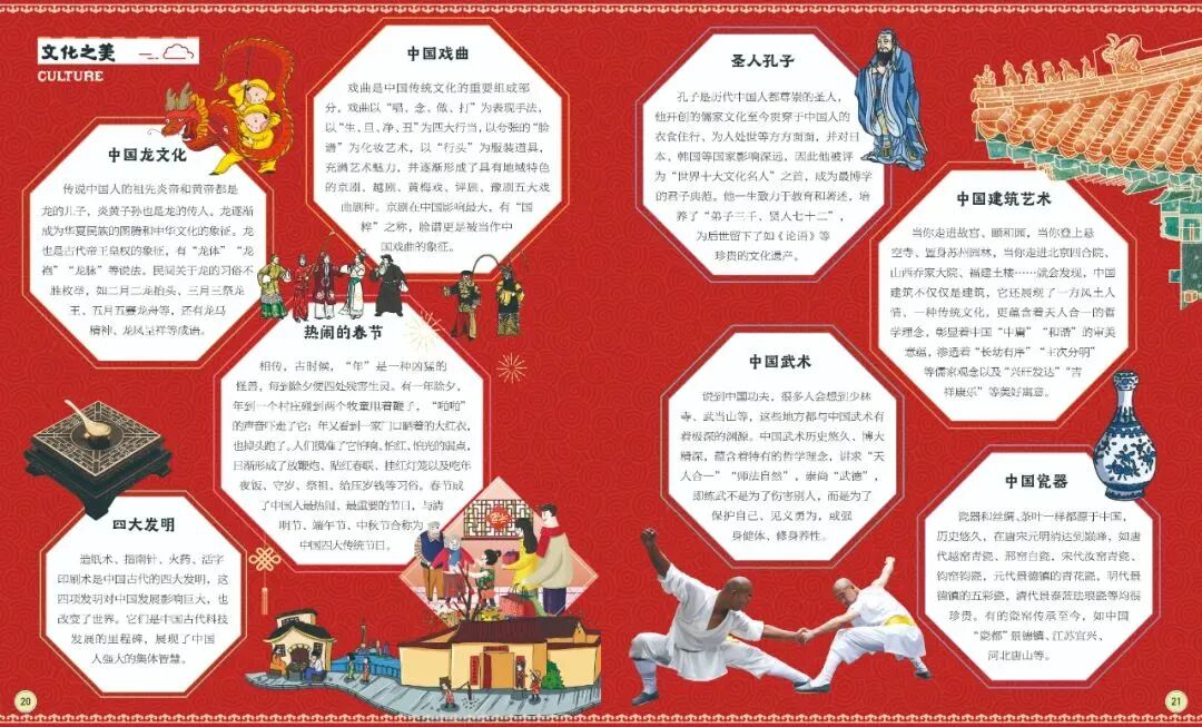 如中国的文化页面,就采用了“中国红”和中国传统建筑的八角窗棂作为搭配布局,体现中国风。
