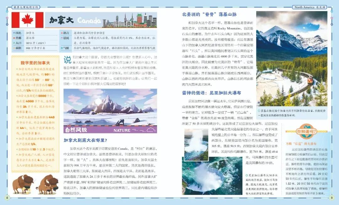 其中,有很多我们“早已耳闻”的,如美国,德国,加拿大等。在这套书里,孩子可以进一步了解它们的自然景观,风土人情,地理地貌。
