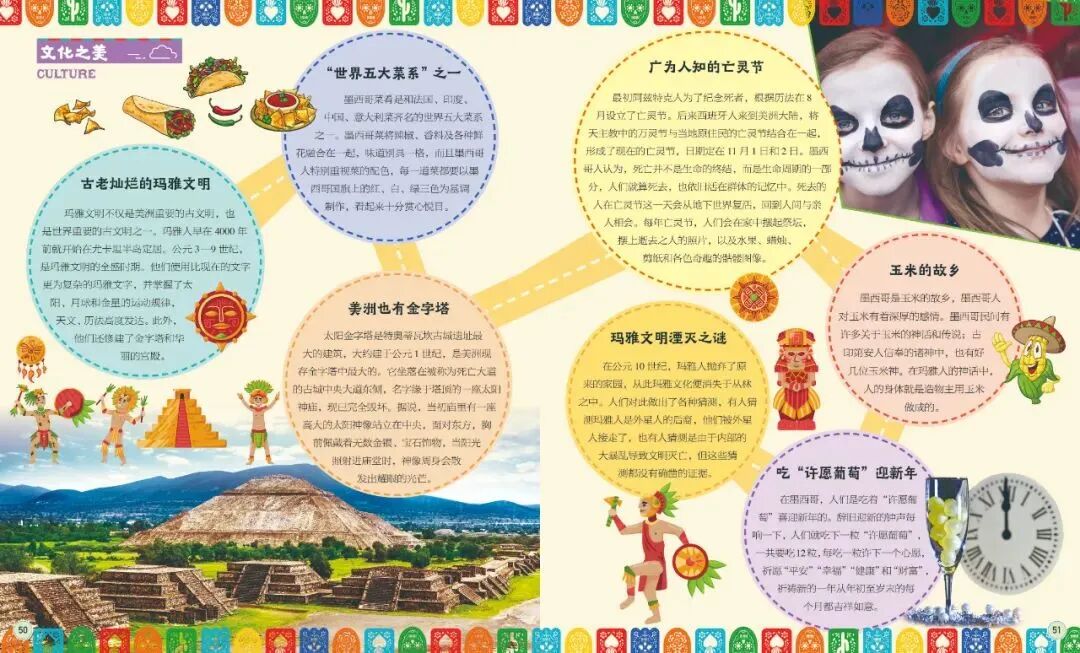 比如墨西哥,很多孩子对墨西哥的印象更多停留在自然地理上。但墨西哥的文化也不可小觑。玛雅文明、美洲的金字塔、世界五大菜系之一……这些都跟墨西哥有关。
