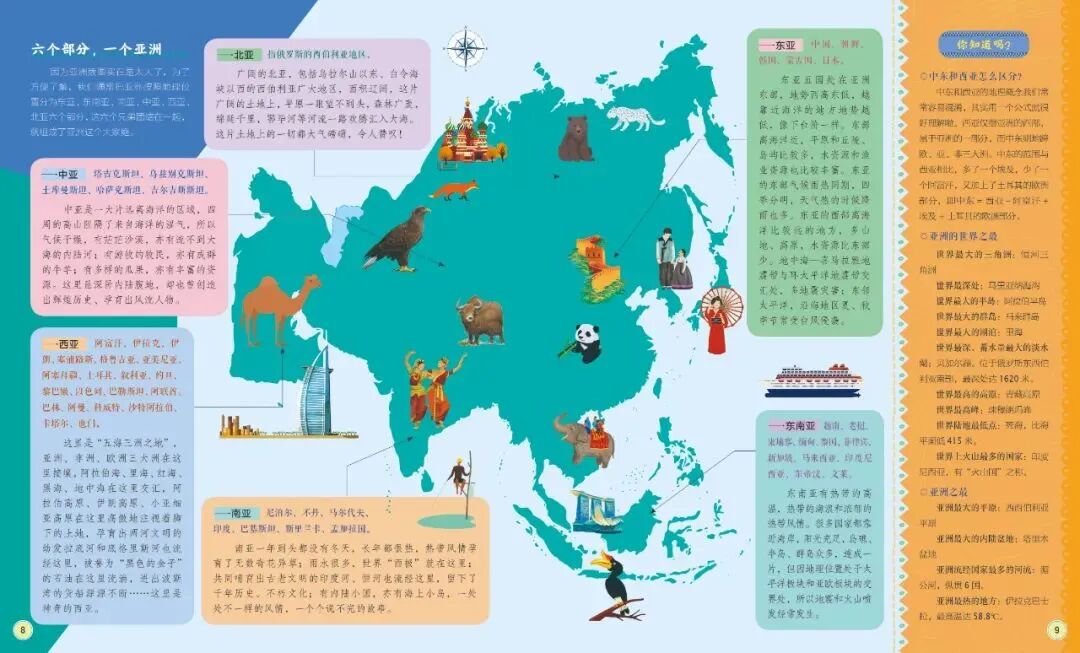 这个页面可以让孩子在阅读的同时,增强区域认知能力,树立更立体化的地理思维,对每个大洲的情况有个整体认知。