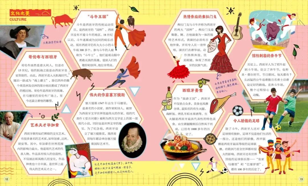 如西班牙文化页面,采用国旗的红黄搭配,颜色鲜亮又灵动,符合这个国家的文化特征。