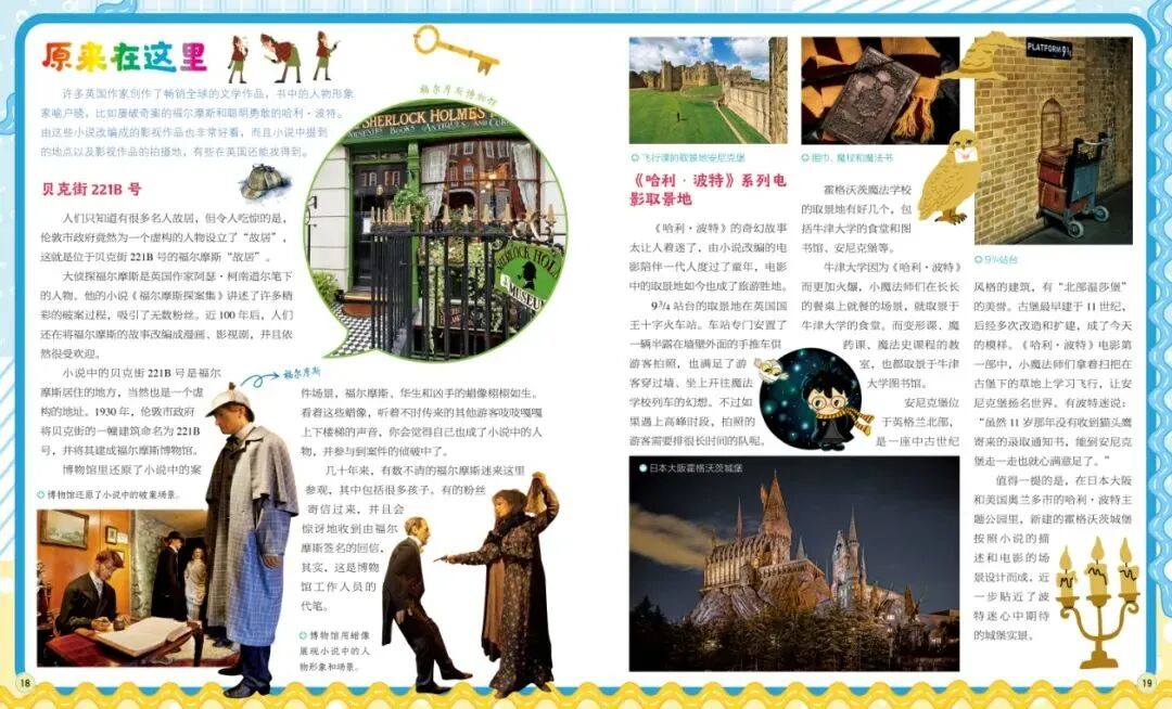 如《福尔摩斯》中的卷福“故居”贝克街221B、《哈利波特》的取景地。这种虚拟和现实的交织,对于爱看作品的孩子来说,是一种很奇妙的感受。