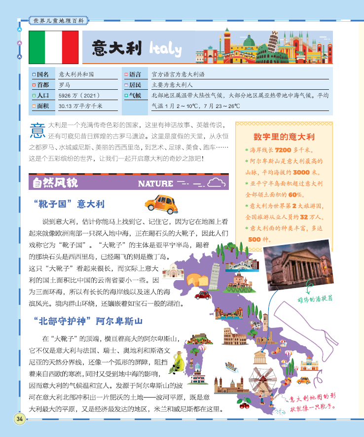 另外,在国家地图设计上,这套书也把轮廓趣味化、形象化,让孩子记得更深刻,且体现该国特色。