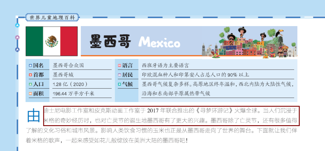 而关于墨西哥国家的介绍,更是从孩子喜爱的动画片《寻梦环游记》引入,