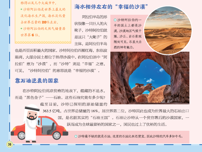 “阿拉伯”这个名字是什么意思?原来在阿拉伯语中,“阿拉伯”=沙漠。叫这个名字是因为该国地处热带沙漠气候,大部分地区被沙漠覆盖。