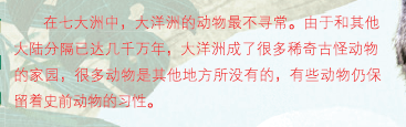 最有代表性的是大洋洲,因为那里的很多动植物都是其他地方没有的。这是因为大亚洲相对独立,动物们没有天敌,所以物种多样性非常丰富。