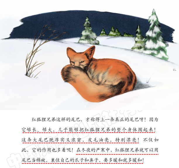 还有,松鼠小弟的毛茸茸大尾巴,就跟大斗篷一样可以用来遮风挡雨。在寒冷的夜晚,还可以当做棉被,裹住自己的小脚丫和鼻子来取暖。