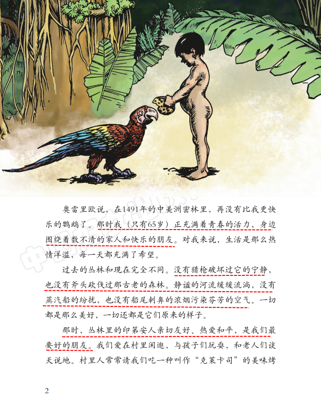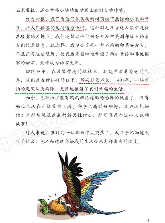 他是一只上了年纪的鹦鹉,据它自己推算,差不多有500岁了。而且,他还告诉“我”:真正发现了美洲的人,并不是哥伦布……(读到这,好奇心是不是一下子就被勾起来了?但凡学过历史的人都知道:哥伦布发现新大陆,难道有哪里不对吗……)