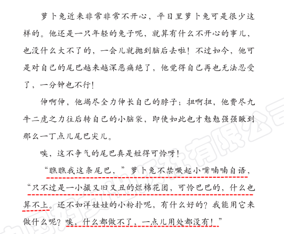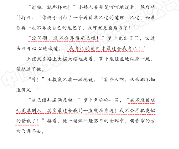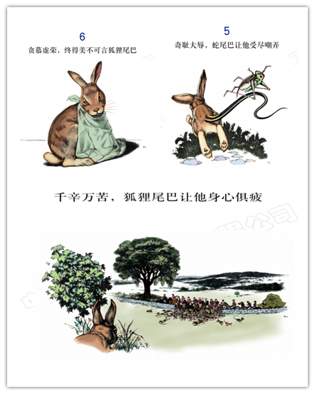 他在换尾巴以后,遭遇了很多从前没遭受过的欺负、羞辱、甚至接二连三的坏运气。这个故事告诉孩子,永远不要一味地跟别人相比,更不要妄自菲薄。