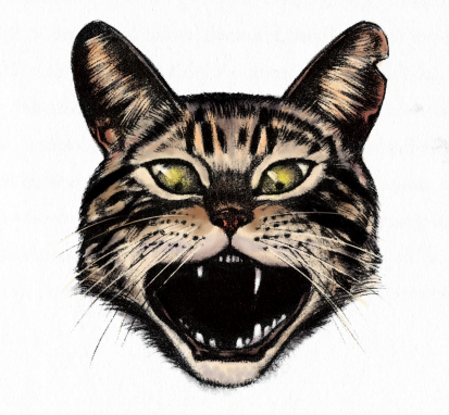 大猫的头现在看起来庞大无比,嘴巴张开,两排白色獠牙露了出来,还有双眼睛像燃烧的焦煤一样闪闪发光。