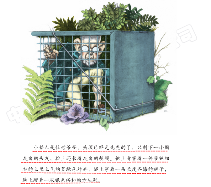 头顶已经光秃秃的了,只剩下一小圈灰白的头发,脸上还长着灰白的胡须。他身上穿着一件带铜纽扣的土里土气的蓝绿色外套,腿上长着长度齐膝的裤子,脚上蹬着一双银色搭扣的方头鞋。