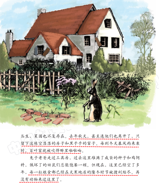 兔子爸爸小心穿过长期无人照料的菜园,高大的砖房孤单地立在黄昏里,黑漆漆地若隐若现。它看起来颇为阴沉暗淡,窗户里没有一丝灯光,附近也杳无人影。