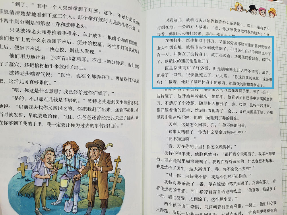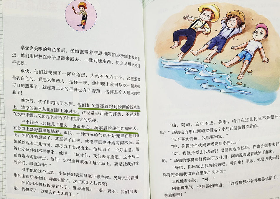 比如这篇:汤姆带着小伙伴去沙洲找海龟蛋的故事,他们玩累了开始想家了,于是汤姆提议他们去寻宝……