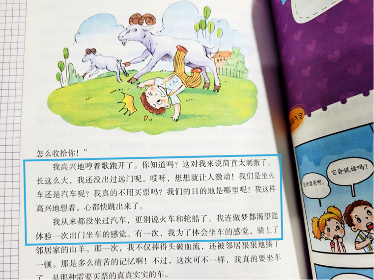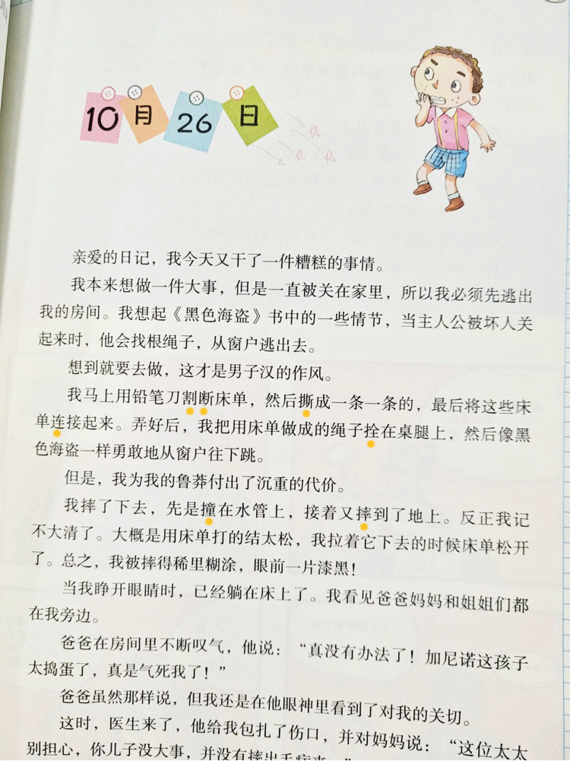 比如,《捣蛋鬼日记》中,加尼诺被关进房间后,打算模仿《黑色海盗》书中的情节逃出去。这个部分的动作描写非常形象,用词也十分精准,值得孩子们写作的时候做参考: