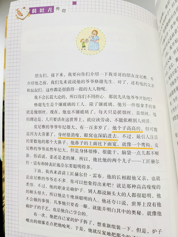 《莫吐儿传奇》中,在描写皮尼雅的爷爷时,对人物长相、人物特点的细节描写很到位: