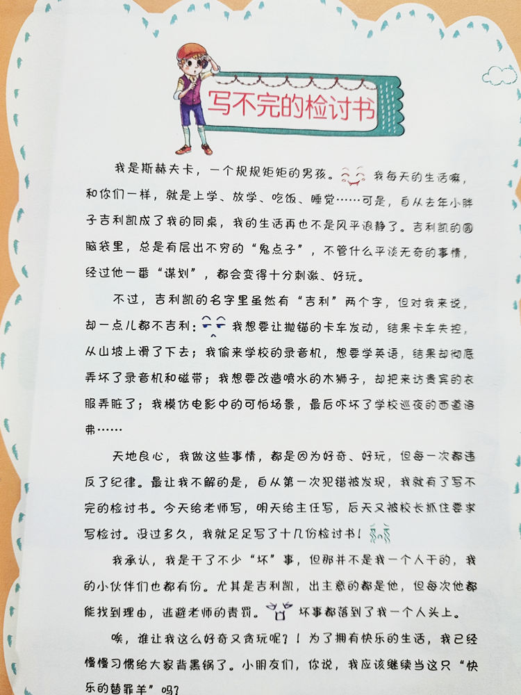 书中的主人公斯赫夫卡表面上是一个经常写检讨书的坏孩子,但他的天真和好奇引发的一个个爆笑故事,却让读者忍俊不禁、回味无穷。