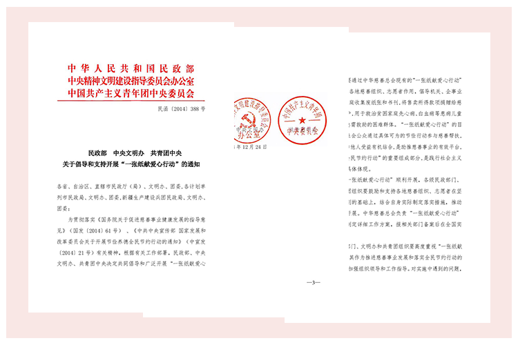 2014年12月24日,民政部、中央文明办、共青团中央发文倡议和支持开展“一张纸献爱心行动”。