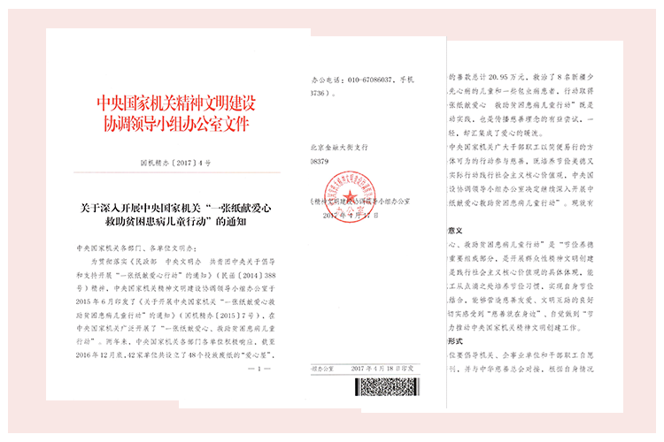 2017年4月17日中央国家机关精神文明建设协调领导小组办公室下发通知“关于深入开展中央国家机关‘一张纸献爱心救助困难患病儿童行动’”