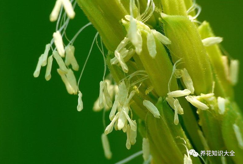 其实稻子也是会开花的,只不过花期比较短。一朵花张开到闭合的时间,差不多在1.5到3小时之间。稻子的花是呈穗状排列的,开的时候从上往下开,稻花很小,并且远远看过去,稻花跟稻子一样呈绿色,因此很容易被忽视。