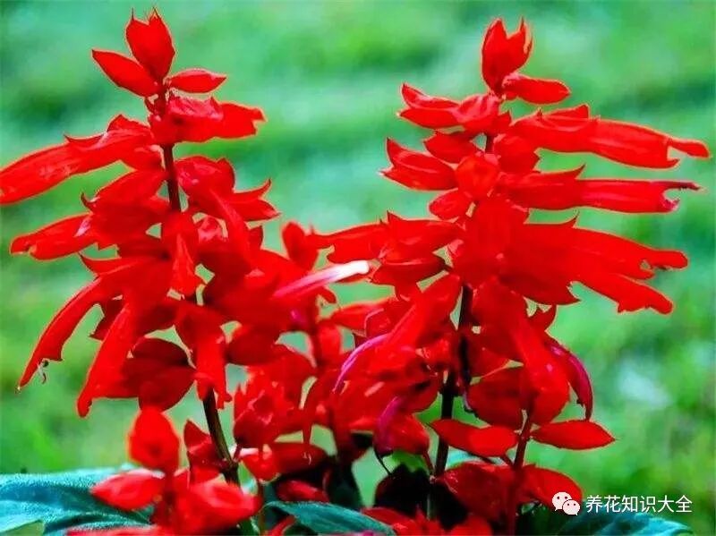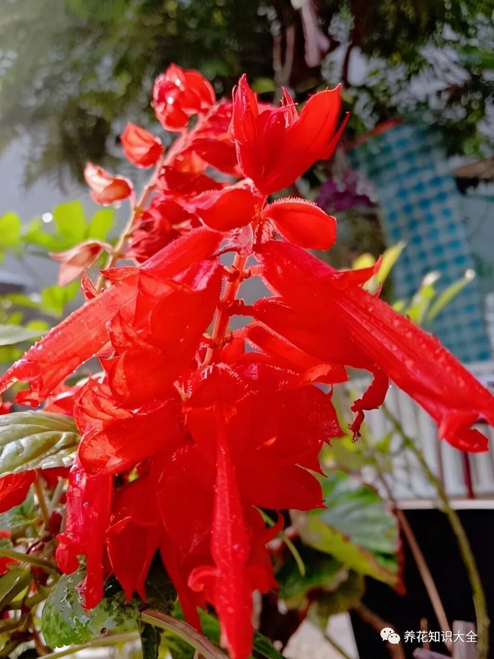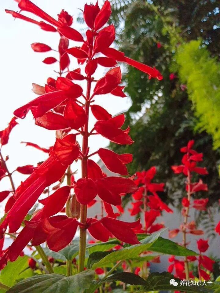 一串红又叫炮仗红,整个外形火辣,长得就像个炮仗。一串红开花的时候,花序很长,花瓣鲜红,向上直立,它不仅是个炮仗,还是个冲天的炮仗。