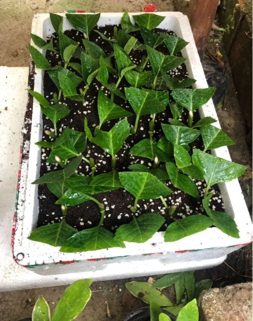 扦插枝条的处理还是保留上部的枝叶,然后将底部切成斜面,之后再将枝条插入泡沫箱的基质内。往基质内加水,得保证枝条的底部能够接触到水分,但是不能碰到底部的泡沫箱。