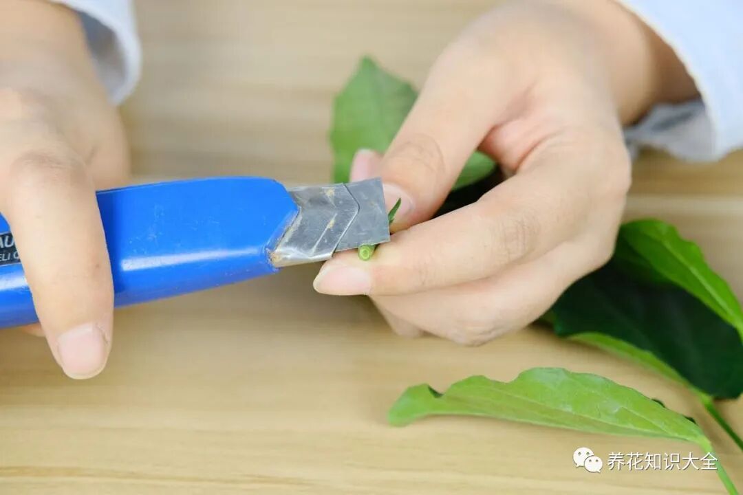 接着是准备需要扦插的枝条。截取健康的粗壮点的枝条,保留顶部的叶子,将底部的枝叶削去,茎干的底部切成一个斜面。截取后的枝条在通风环境下晾干2个小时左右。